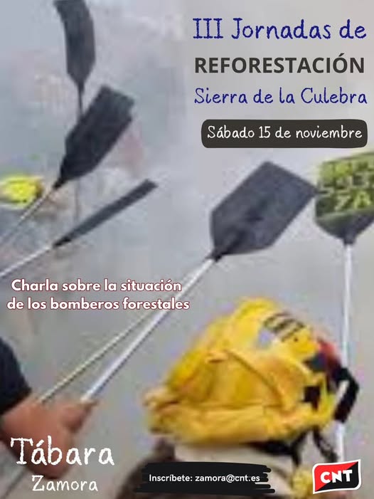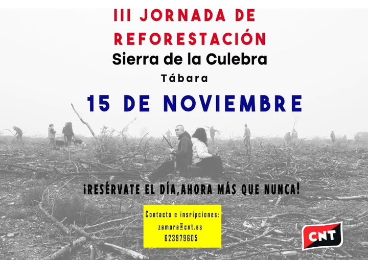 Este 15 de noviembre de 2025 tuvo lugar la tercera edición del encuentro convocado por CNT Zamora en la parcela comunal del lugar de Tábara (Sierra de la Culebra, Zamora) para recuperar la zona de los incendios del 2022 y de las causas estructurales -y criminales de guante blanco- que los han provocado.